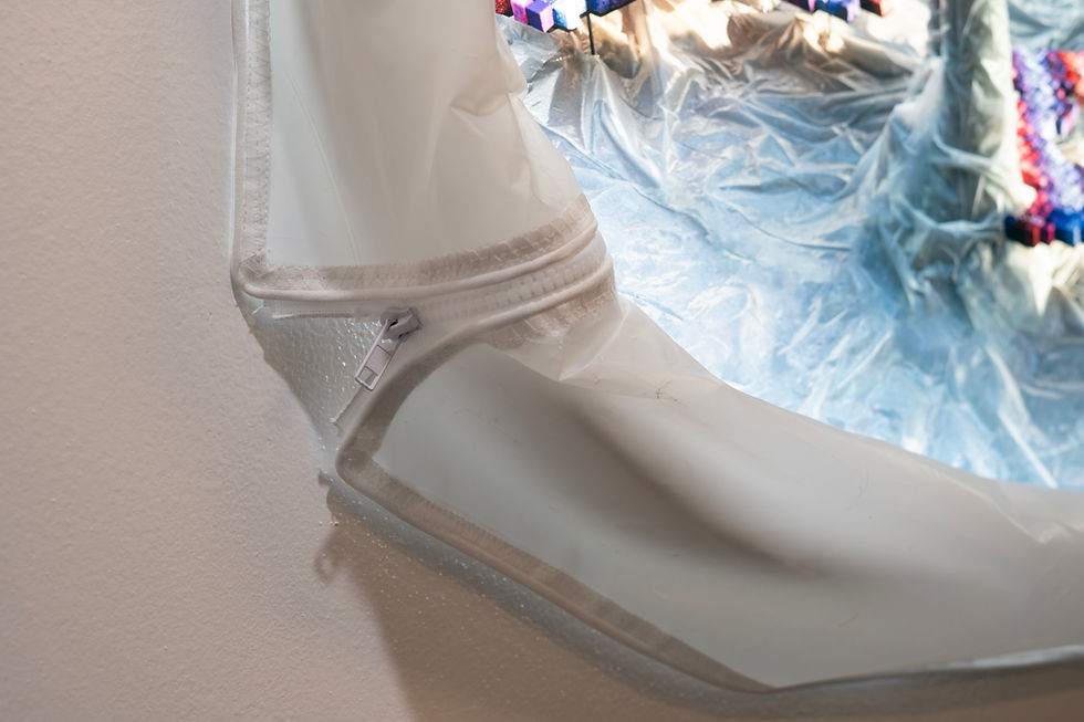 trapunto on brick patterned plastic and chiffon, spray-painted vinyl, wood, velcro, steel